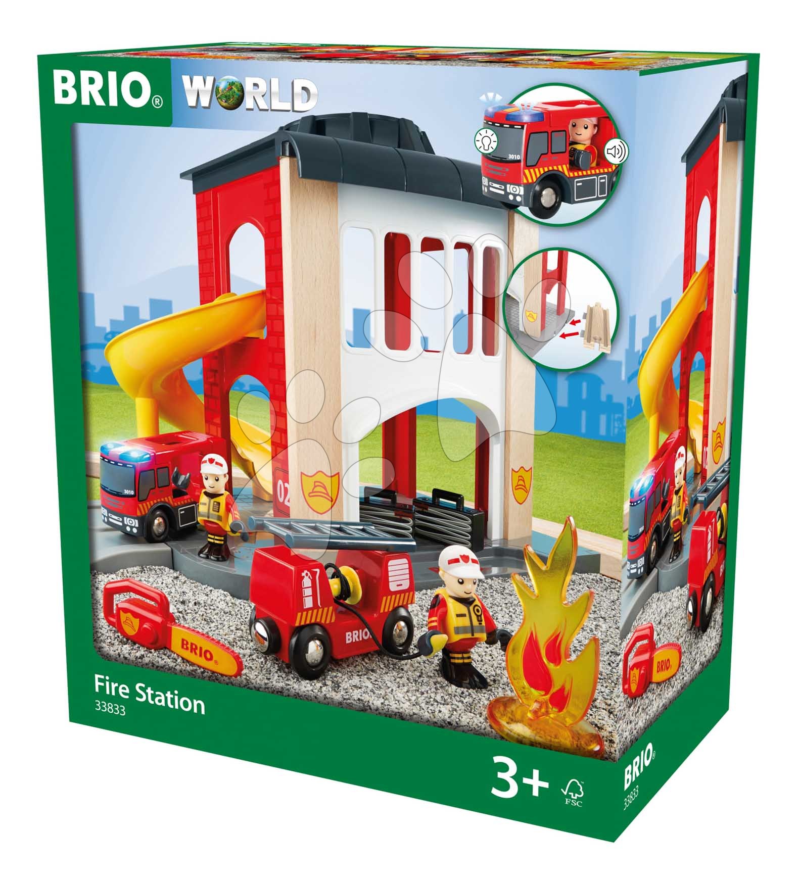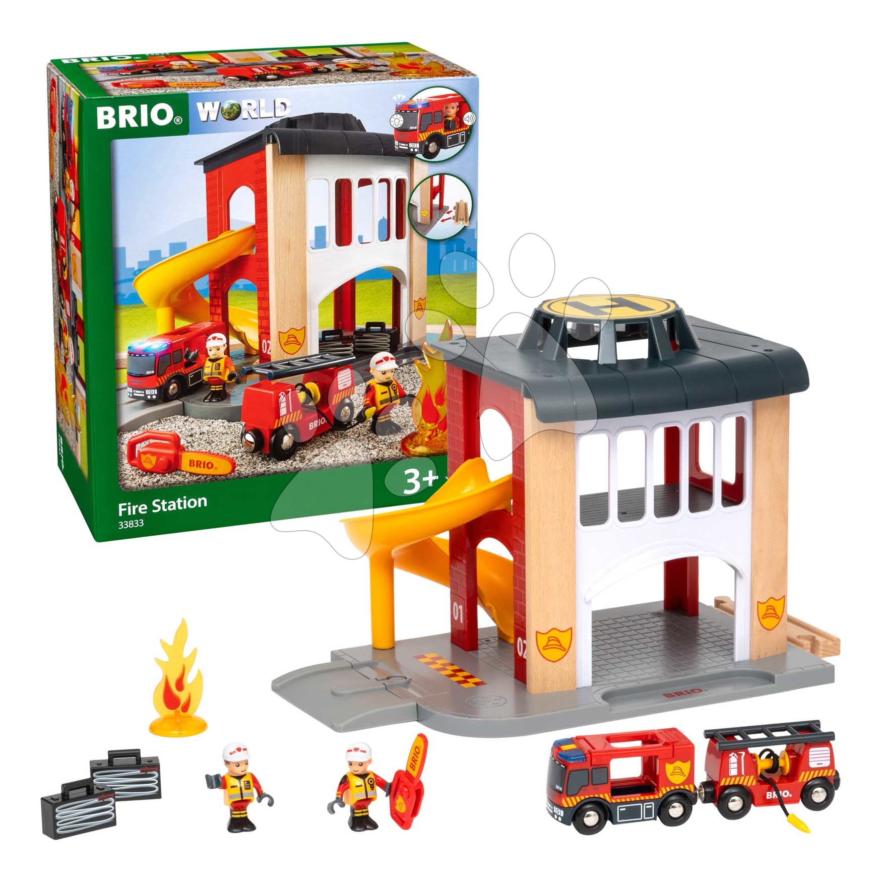 Drevená požiarna stanica 2 poschodová Fire Station BRIO so šmykľavkou a hasičské autíčko so zvukom a svetlom od 3 rokov BRIO8331
