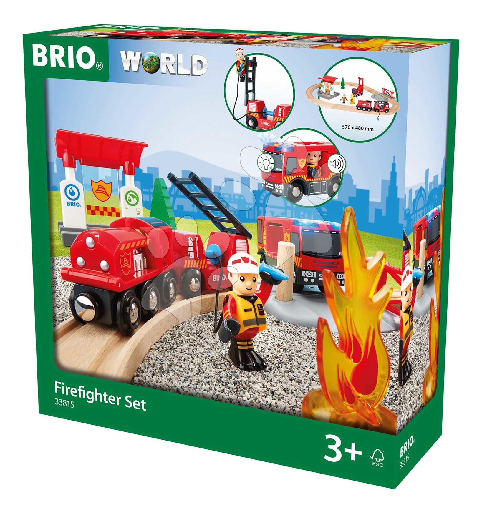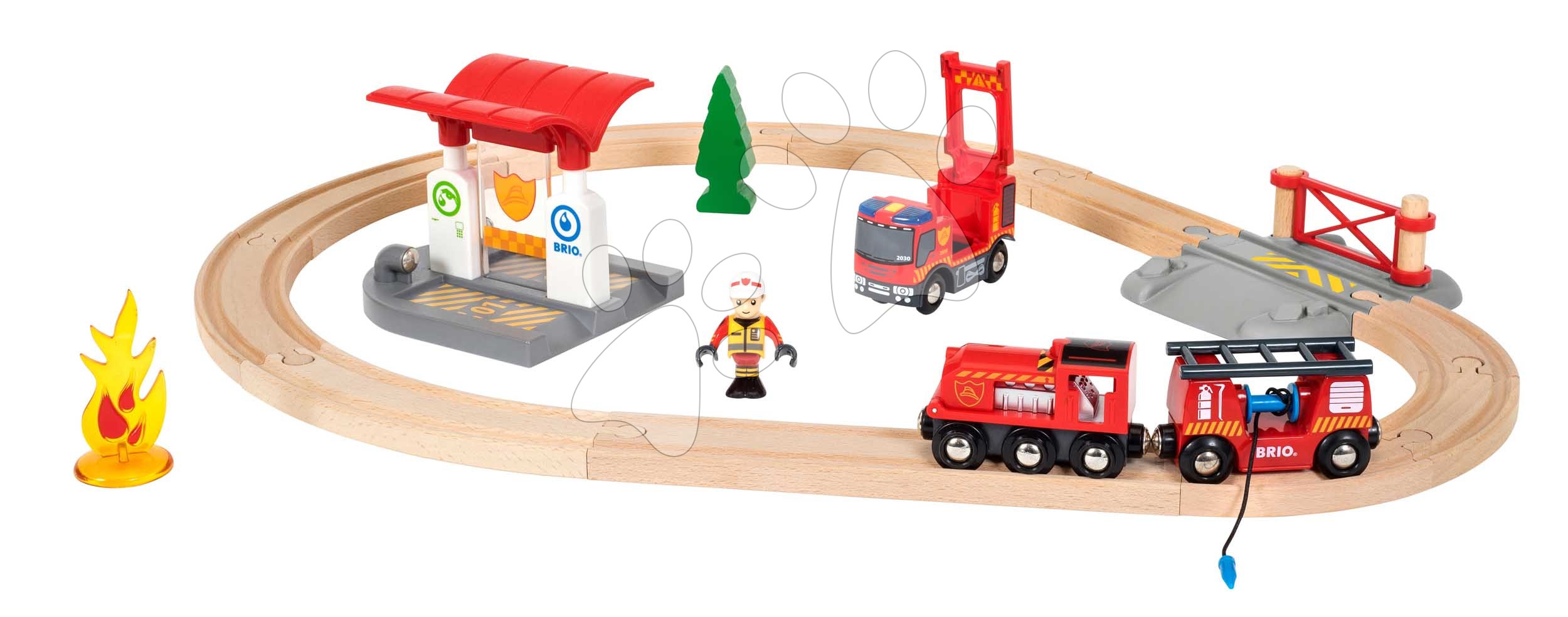 Drevená vláčikodráha Požiarna stanica Firefighter Set BRIO 18 dielov s hasičským vlakom so svetlom a zvukom od 3 rokov BRIO8157