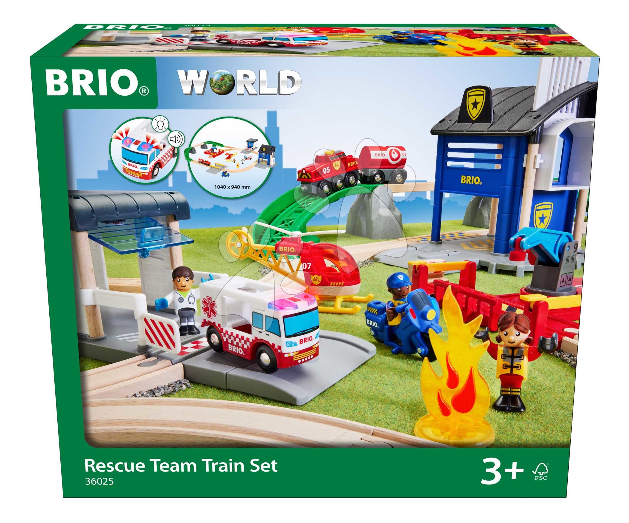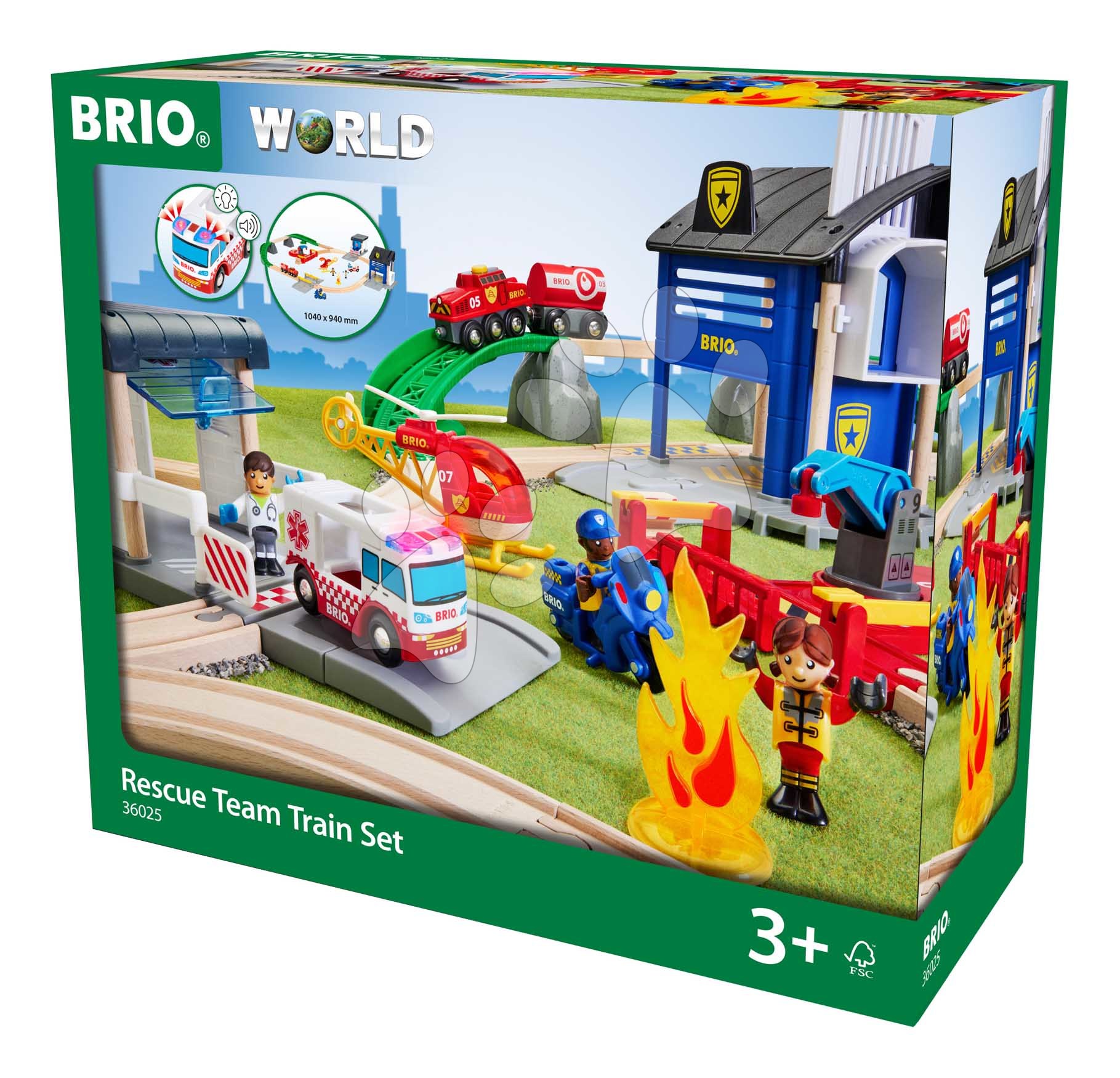 Drevená vláčikodráha so záchranárským tímom Rescue Team Train Set BRIO 38 dielov sanitka so zvukom a svetlom a policajné autíčko so stanicou a 3 figúrky od 3 rokov BRIO0257