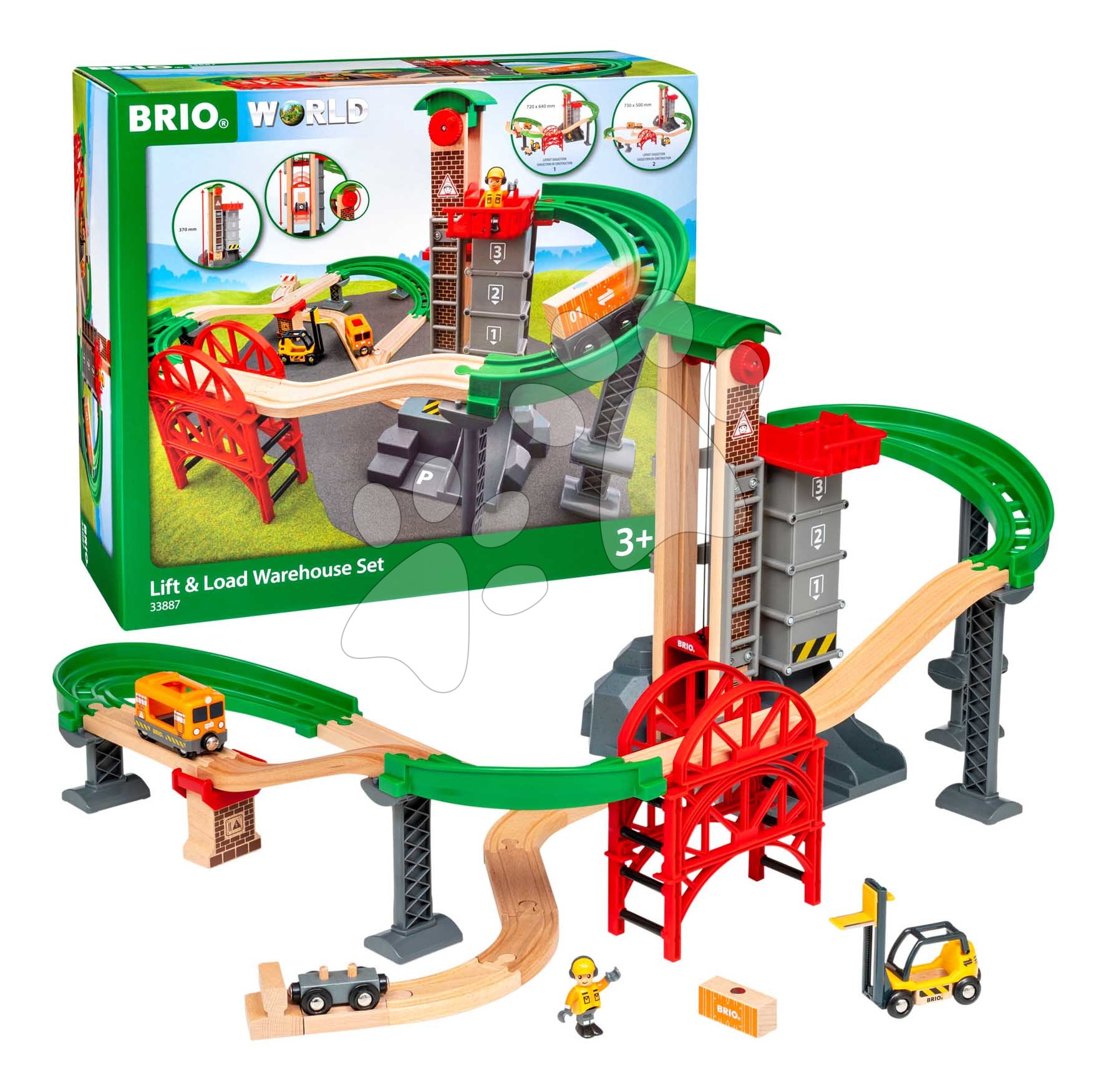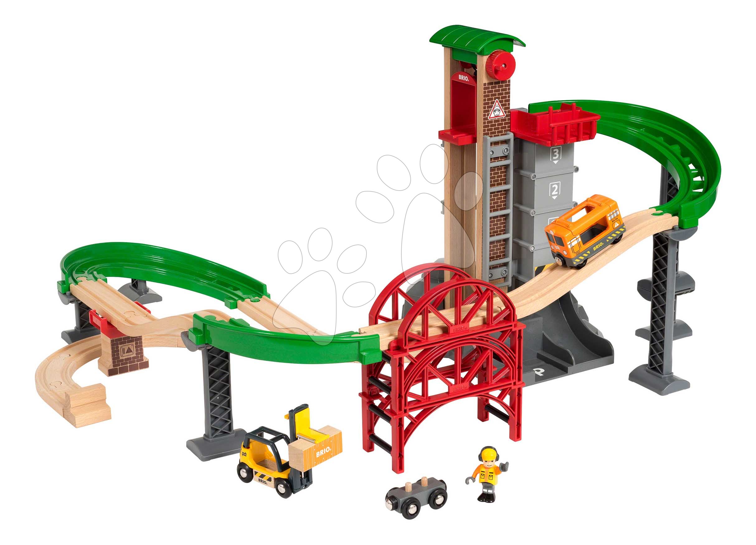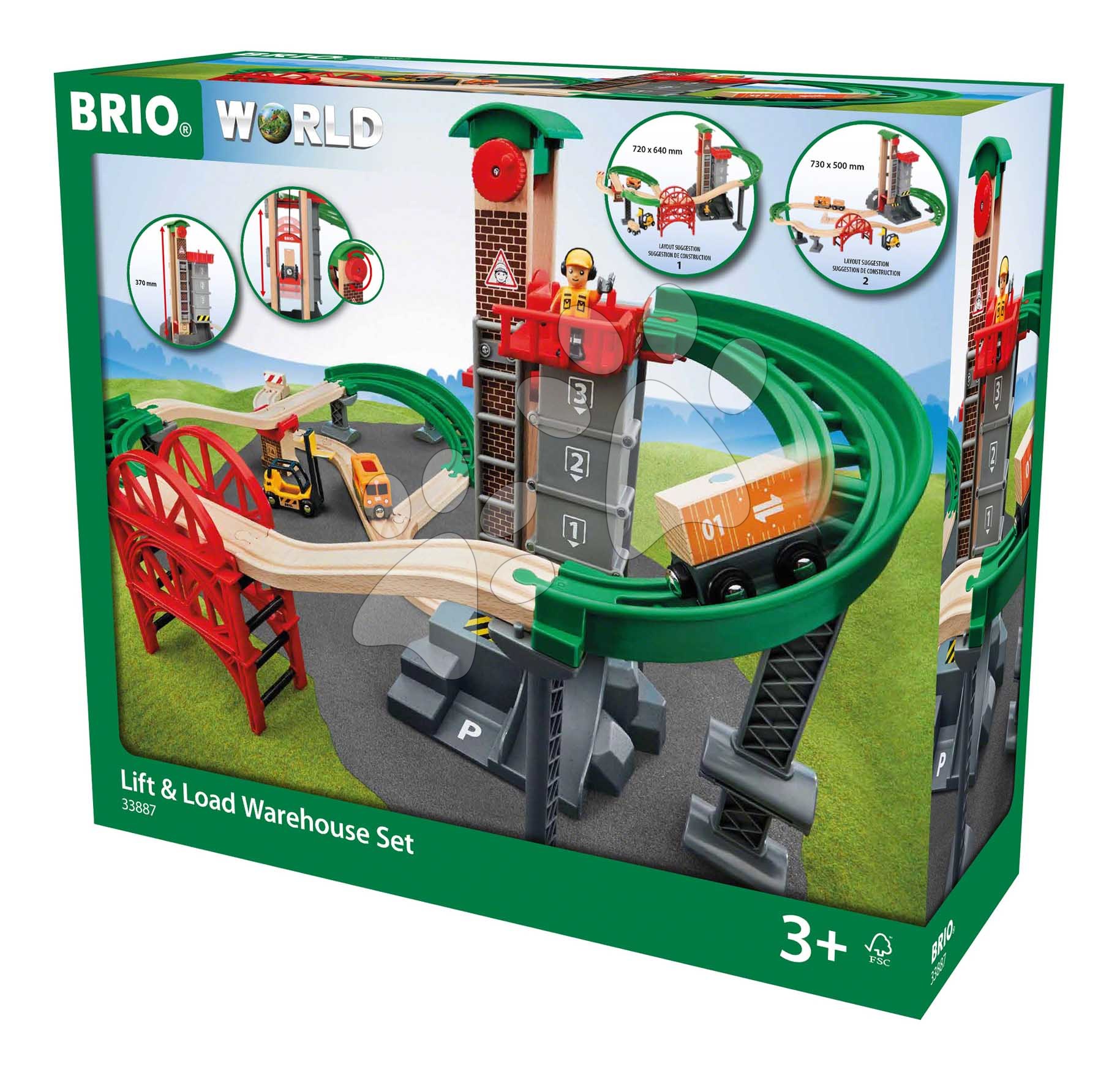 Drevená vláčikodráha s výťahom a skladom Lift&Load Warehouse Set BRIO 32 dielov s mostom vláčikom a figúrkou od 3 rokov BRIO8874