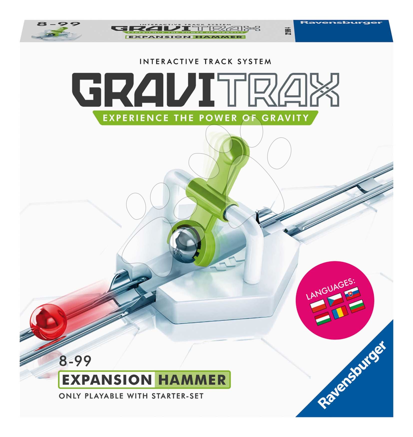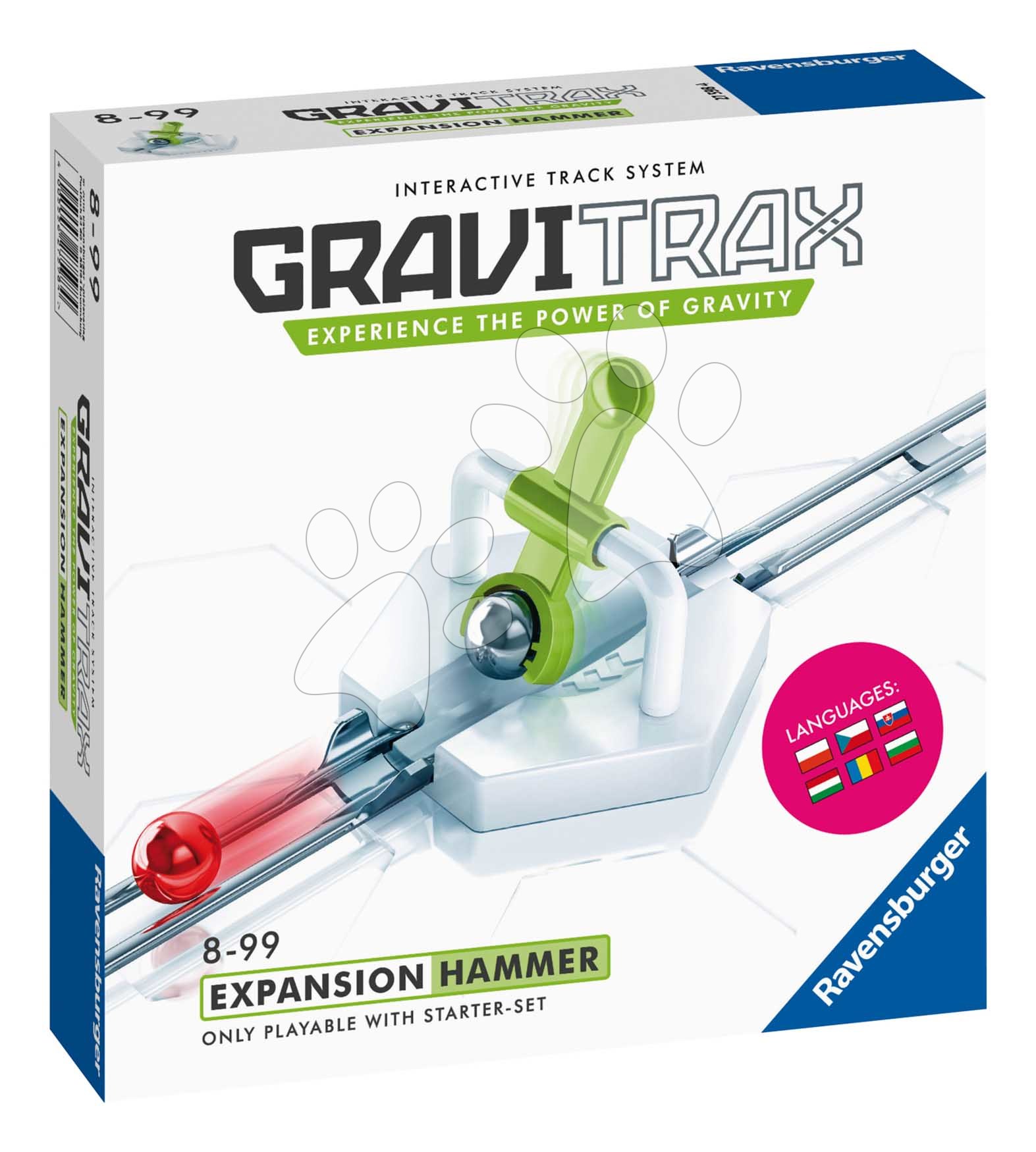 Die GraviTrax Hammer Extension ist eine kompatible Erweiterung für die Startersets der Kugelbahnsysteme GraviTrax und GraviTrax PRO. Das Bauelement Hammer sorgt für einen kräftigen Impuls und beschleunigt die Kugel rasant, sodass sie das Ziel noch schneller erreicht. Die Erweiterung besteht aus hochwertigem Kunststoff und begeistert Kinder und Erwachsene ab 8 Jahren. Im Lieferumfang enthalten sind das Hammer-Element, eine Anleitung sowie sechs Schienen in unterschiedlichen Längen. So entdecken kleine Konstrukteure eine weitere kreative Möglichkeit, ihr Bahnsystem zu erweitern.