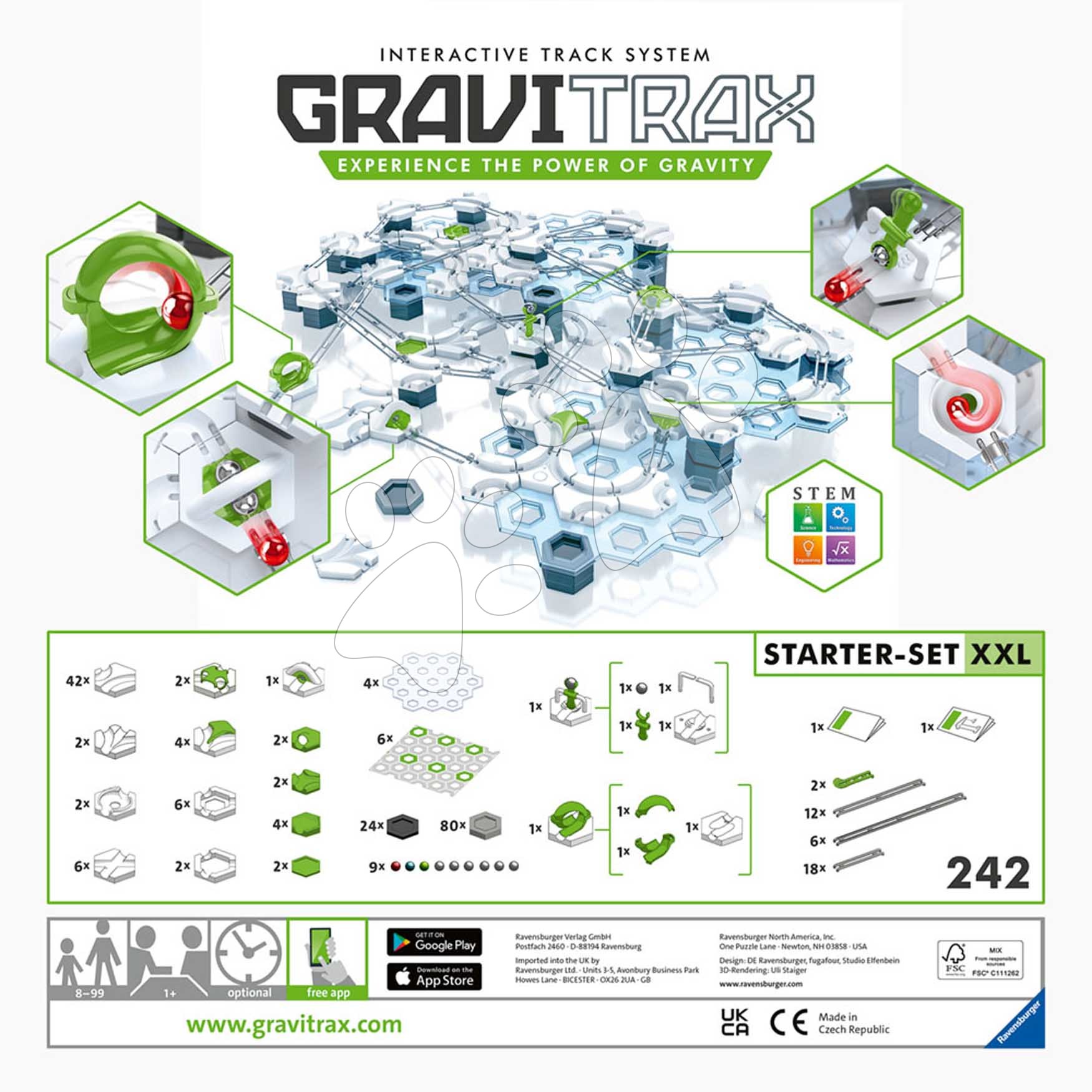 Kugelbahn-Bausatz XXL Starter Set stellt ein großes Basisset dar, mit dem Jungen und Mädchen ab 8 Jahren viel Spaß haben. Die Kugelbahn bietet kleinen Ingenieuren unendliche Möglichkeiten beim kreativen Entwerfen und Bauen ihrer eigenen Bahn. Der Bausatz ist ein STEM-Spielzeug, durch das Kinder spielerisch die grundlegenden Prinzipien von Gravitation, Magnetismus und kinetischer Energie kennenlernen. Zum 242-teiligen Zubehör gehören Bausteine, eine Anleitung, Höhenelemente, Schienen in verschiedenen Längen, eine magnetische Kanone zur Energieübertragung auf eine weitere Kugel, ein Hammer zur Beschleunigung der Kugel sowie eine Spirale für einen Looping. Mit 9 Kugeln testen die Kinder die Funktionsfähigkeit der Bahn, die jederzeit mit weiteren GraviTrax-Erweiterungen kombiniert werden kann.