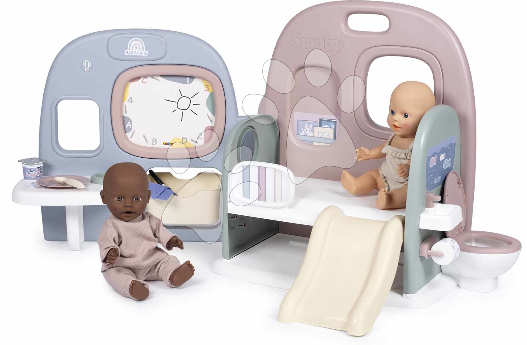 Das Puppenhaus Baby Care Childcare Center des französischen Herstellers Smoby ist ein hervorragendes Geschenk für Mädchen ab 3 Jahren, die gerne mit Puppen spielen. Das multifunktionale Puppenzentrum mit 5 Spielzonen bietet den Kindern umfassende Erlebnisse bei der Pflege ihrer Puppe und zeichnet sich durch sanfte Pastellfarben aus. Das Puppenhaus ermöglicht den Kindern den Zugang von allen Seiten, lässt sich leicht aufbauen und transportieren. Im originalen 6-teiligen Zubehör-Set befinden sich ein Teller mit Löffel, ein Joghurt mit Deckel, ein Marker und ein Textilstück zum Abwischen. Das wunderschöne Häuschen besticht durch erstklassige Qualität und Robustheit, die in Kombination mit einem funktionalen Design garantiert, dass die Kinder lange Freude daran haben werden.