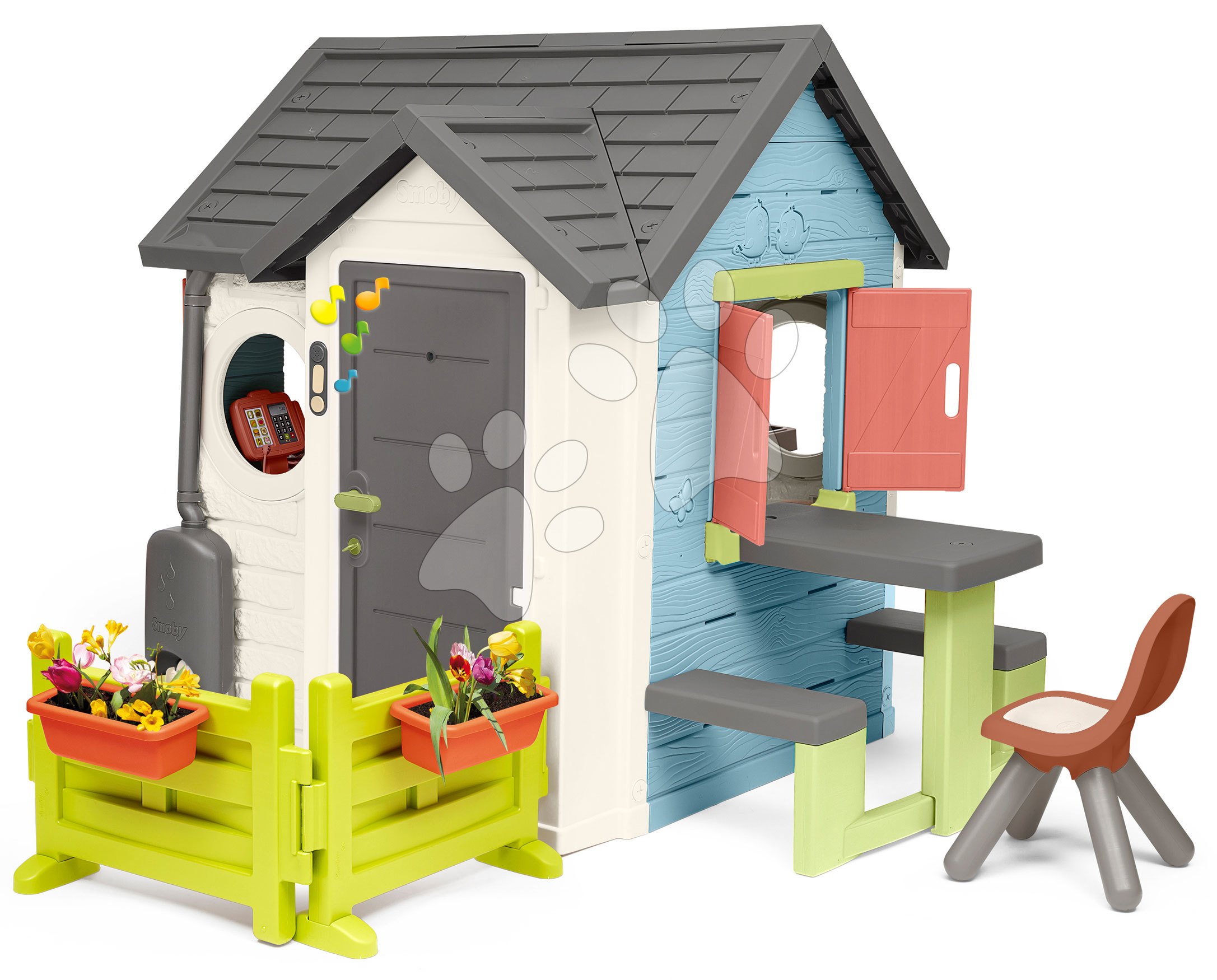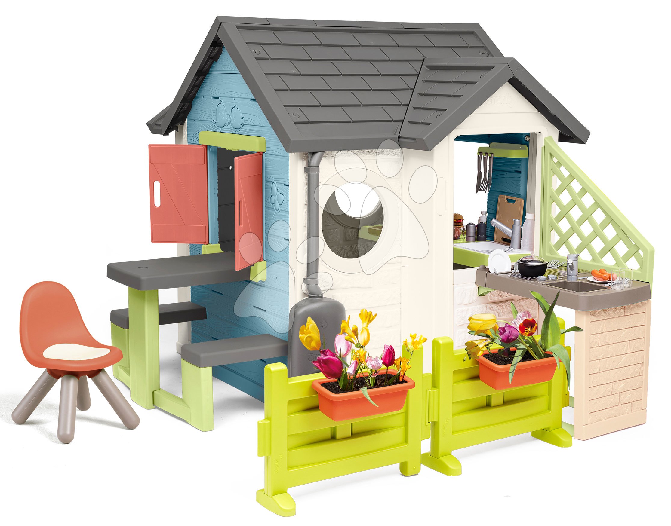 Kleine Verkäufer können sich auf die Kasse mit einer öffnenden Kasse und einer Mikrofon-Replik verlassen. Bezahlt werden kann auch mit Karte über das Kartenlesegerät. Die Kinder werden auch die Regenrinne mit Fass zu schätzen wissen, mit der sie lernen, Regenwasser zu sammeln und mit einer Gießkanne die Pflanzen im Garten zu gießen. Vor dem Häuschen können sie überall einen Gartenzaun mit 2 Blumentöpfen platzieren. Beim Spielen als Köche werden sie sich auch über die Außenküche mit 17 Zubehörteilen freuen, mit der sie weitere großartige Leckereien zubereiten können. Ihre Gäste setzen sie an einen Picknicktisch mit 2 Bänken, an dem sie angenehm entspannen können. Für eine angenehme Entspannung sorgt auch der Stuhl mit Rückenlehne KidChair, der eine Tragfähigkeit von bis zu 50 kg hat.
